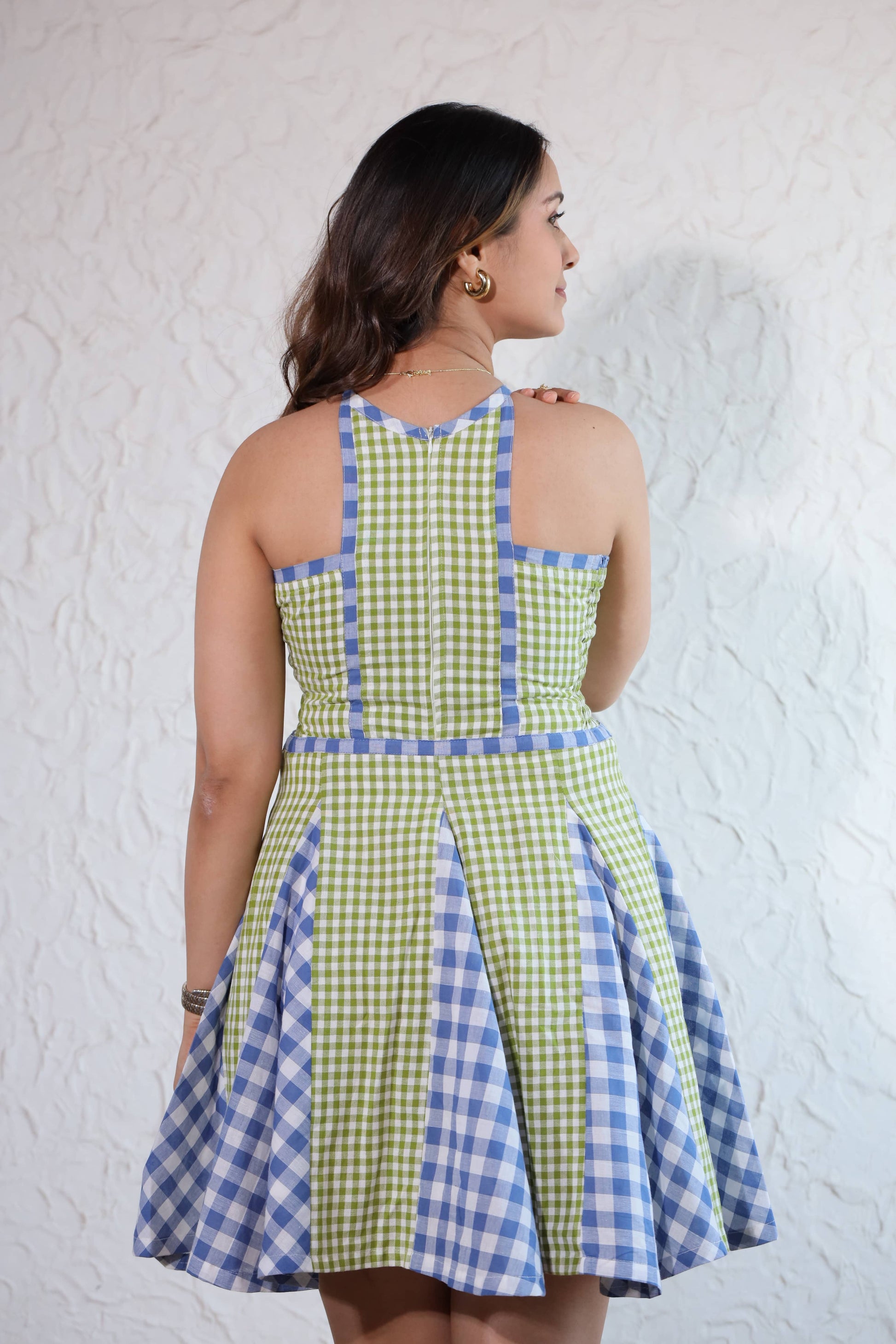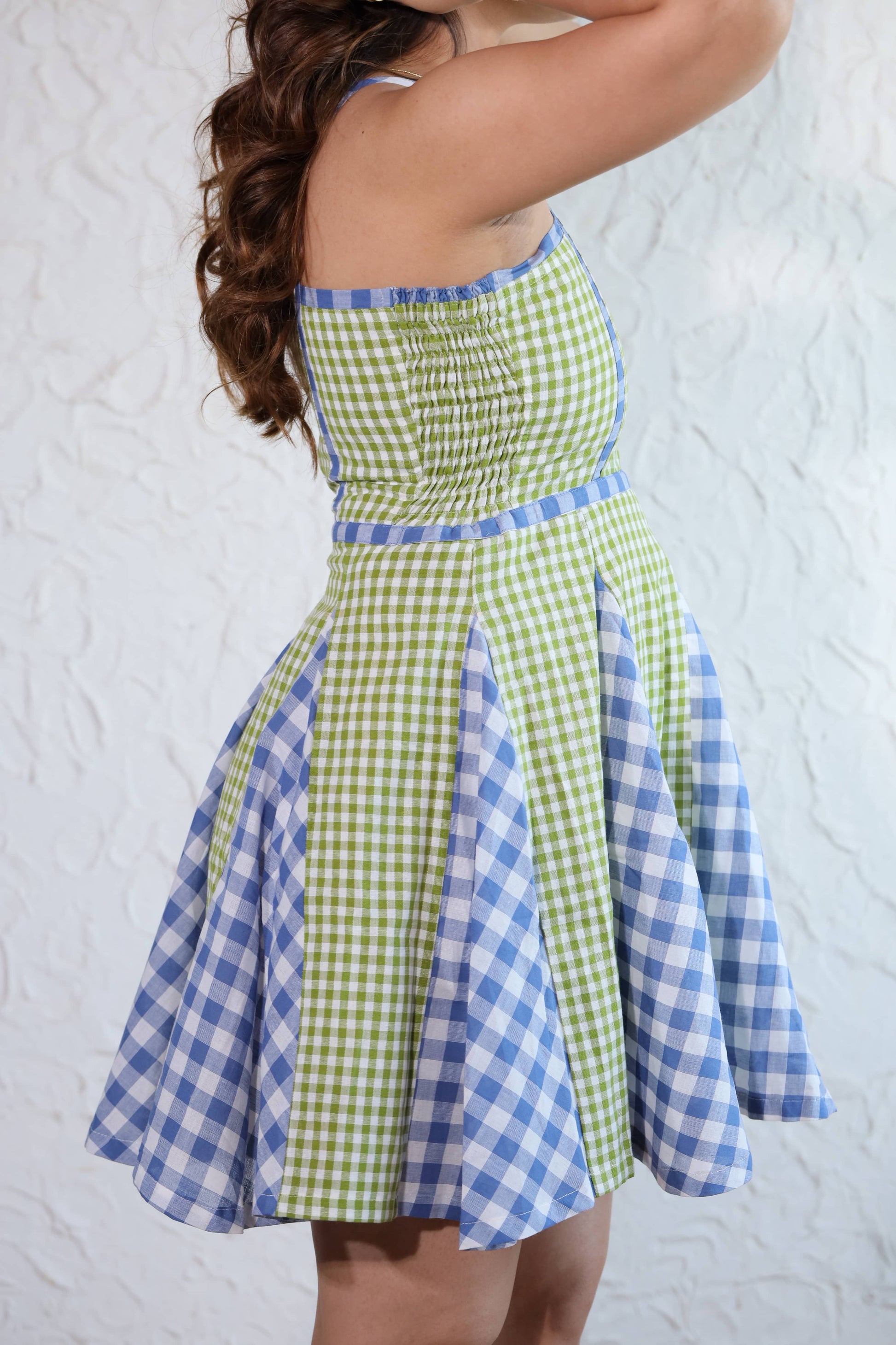 A breezy blend of green gingham and blue checks, crafted in soft South Cotton — this flared, mul-lined dress is made for sunny days and twirl moments.