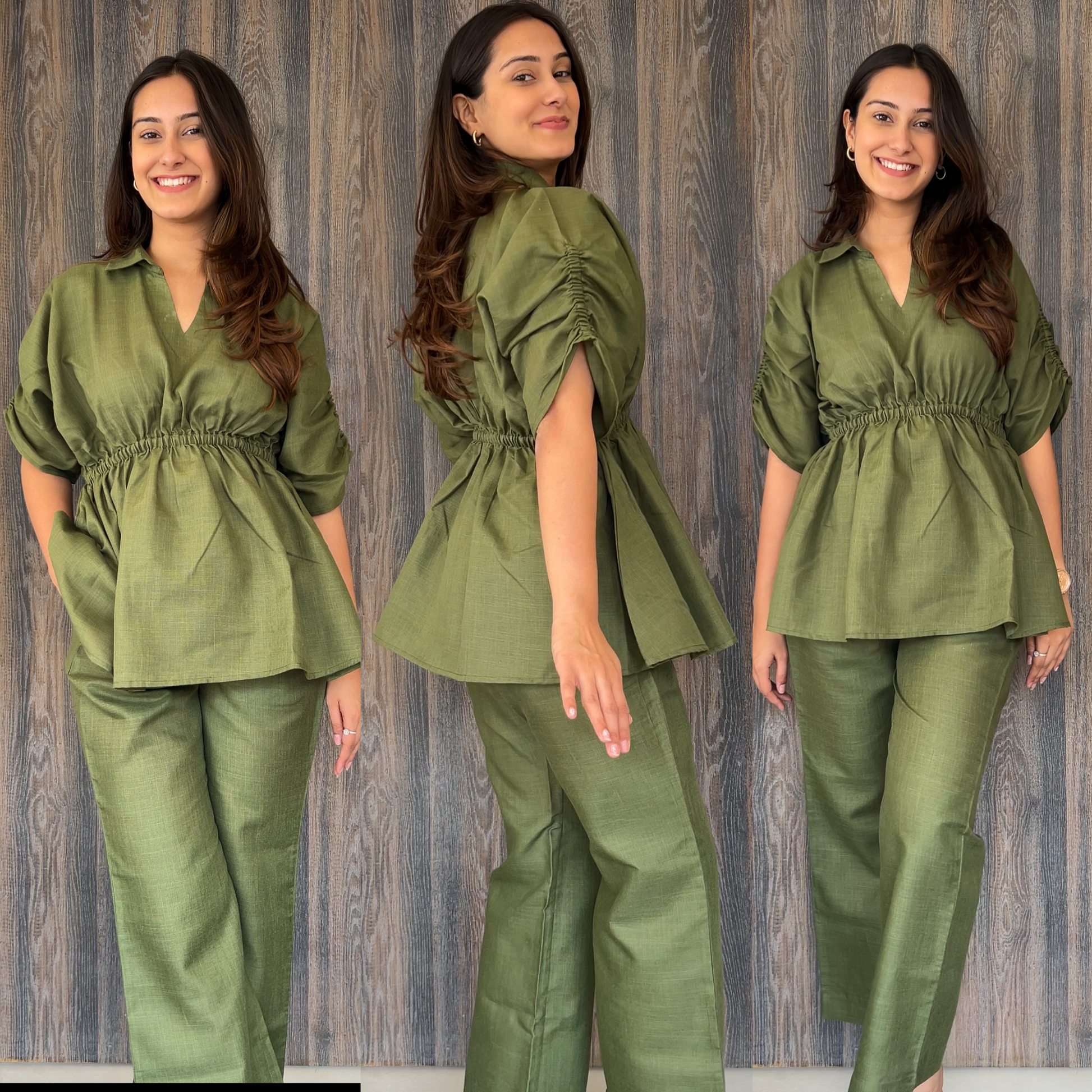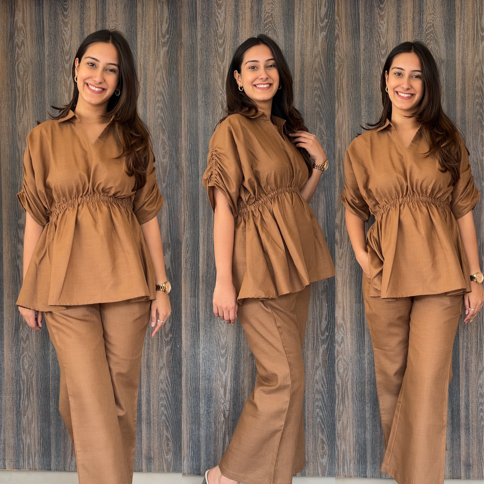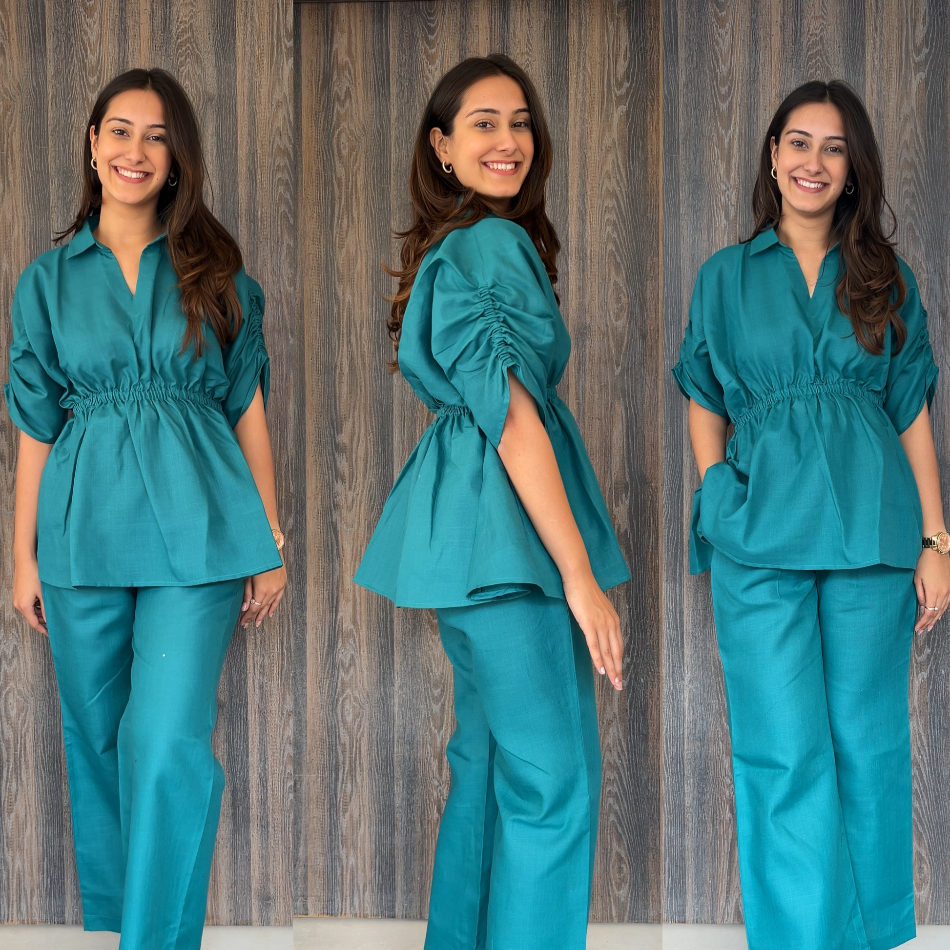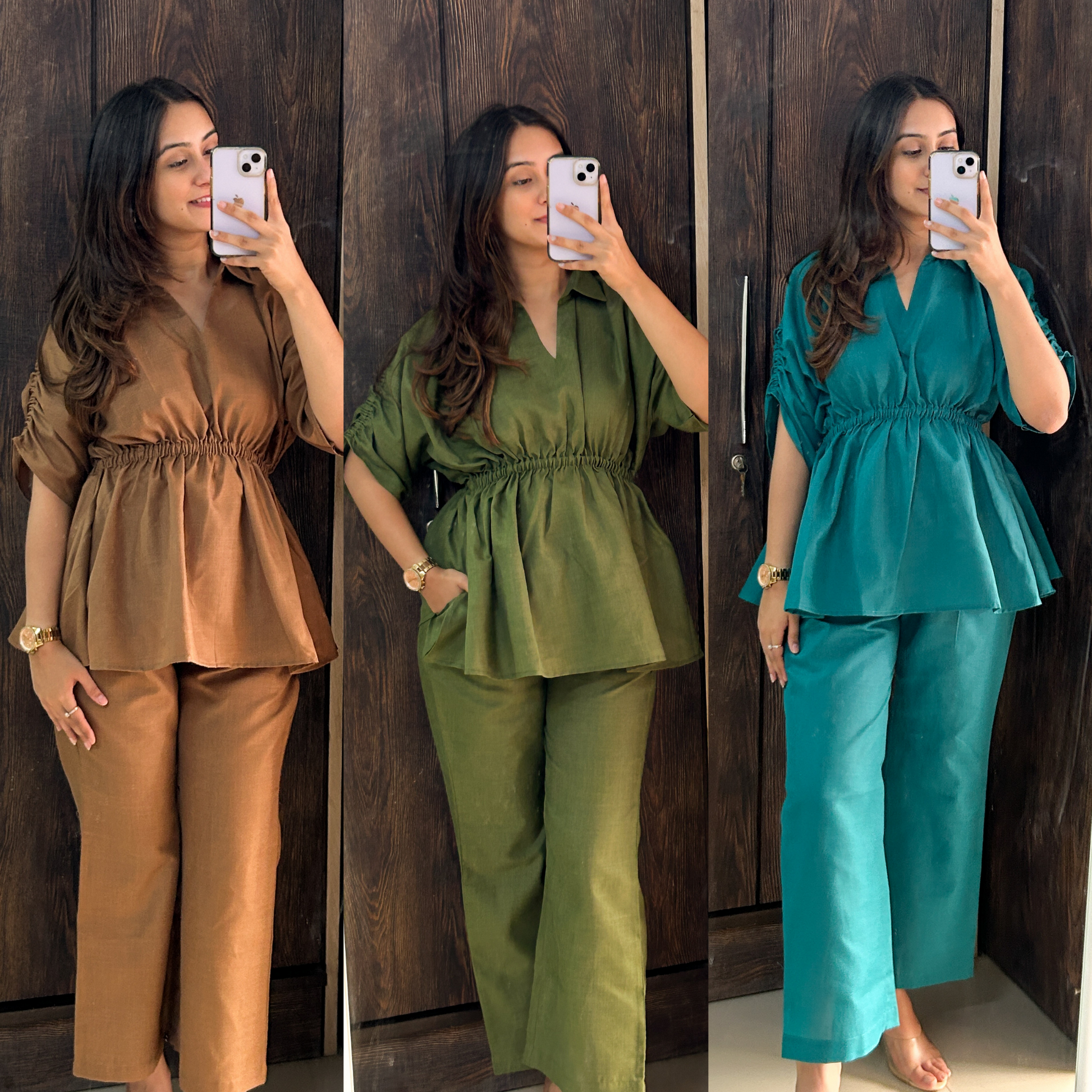Coords for every day, every season & every reason! The set features a kimono pattern top and ankle length flared pants.