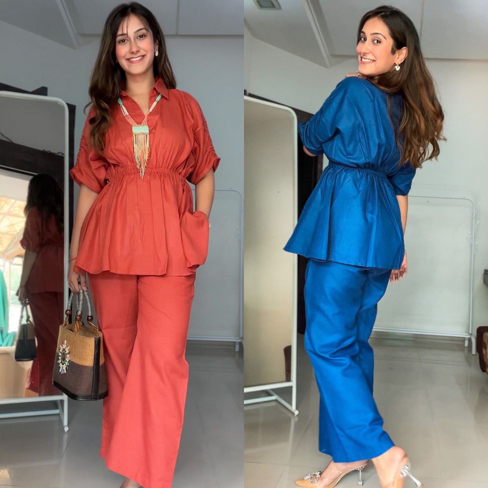 Coords for every day, every season & every reason! The set features a kimono pattern top and ankle length flared pants.