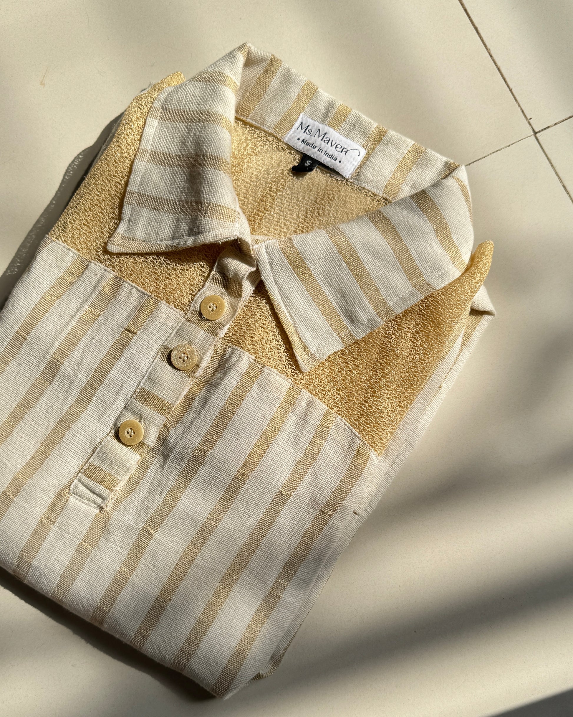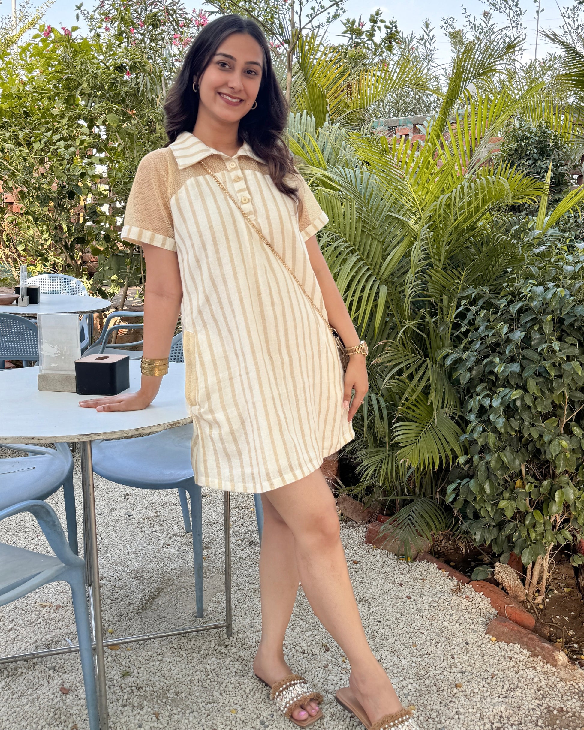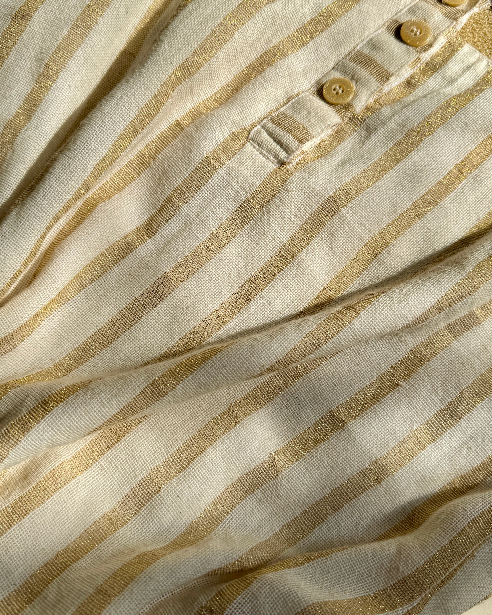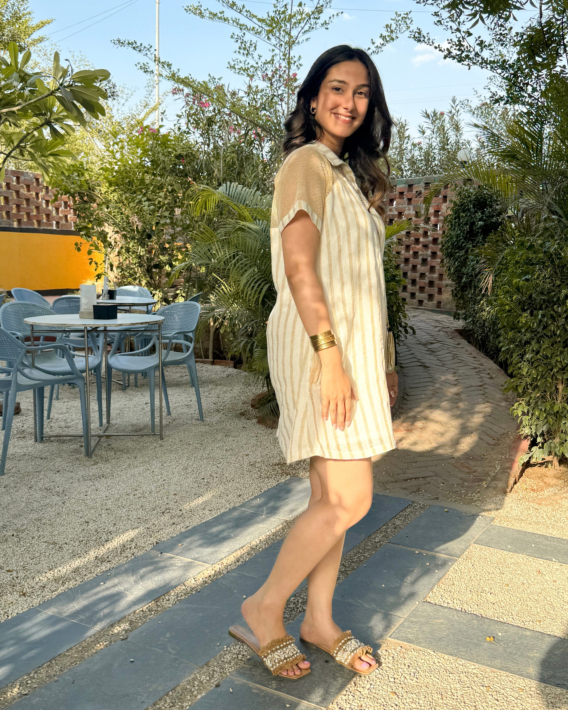 Made from luxurious jute fabric adorned with gold stripe, this stylish dress features kimono sleeves and practical pockets for everyday wear. The beige golden net yoke adds a sophisticated touch, making it perfect for any occasion.