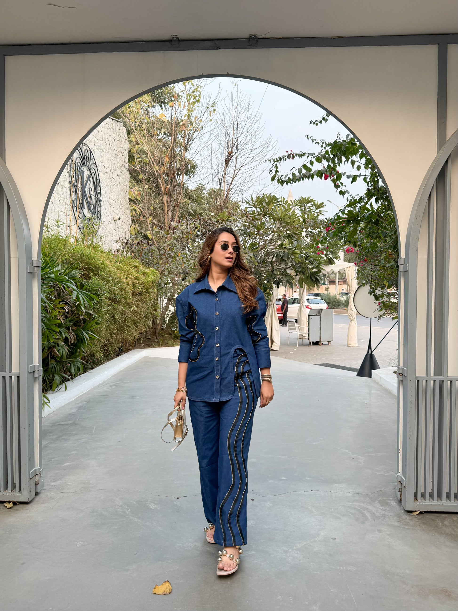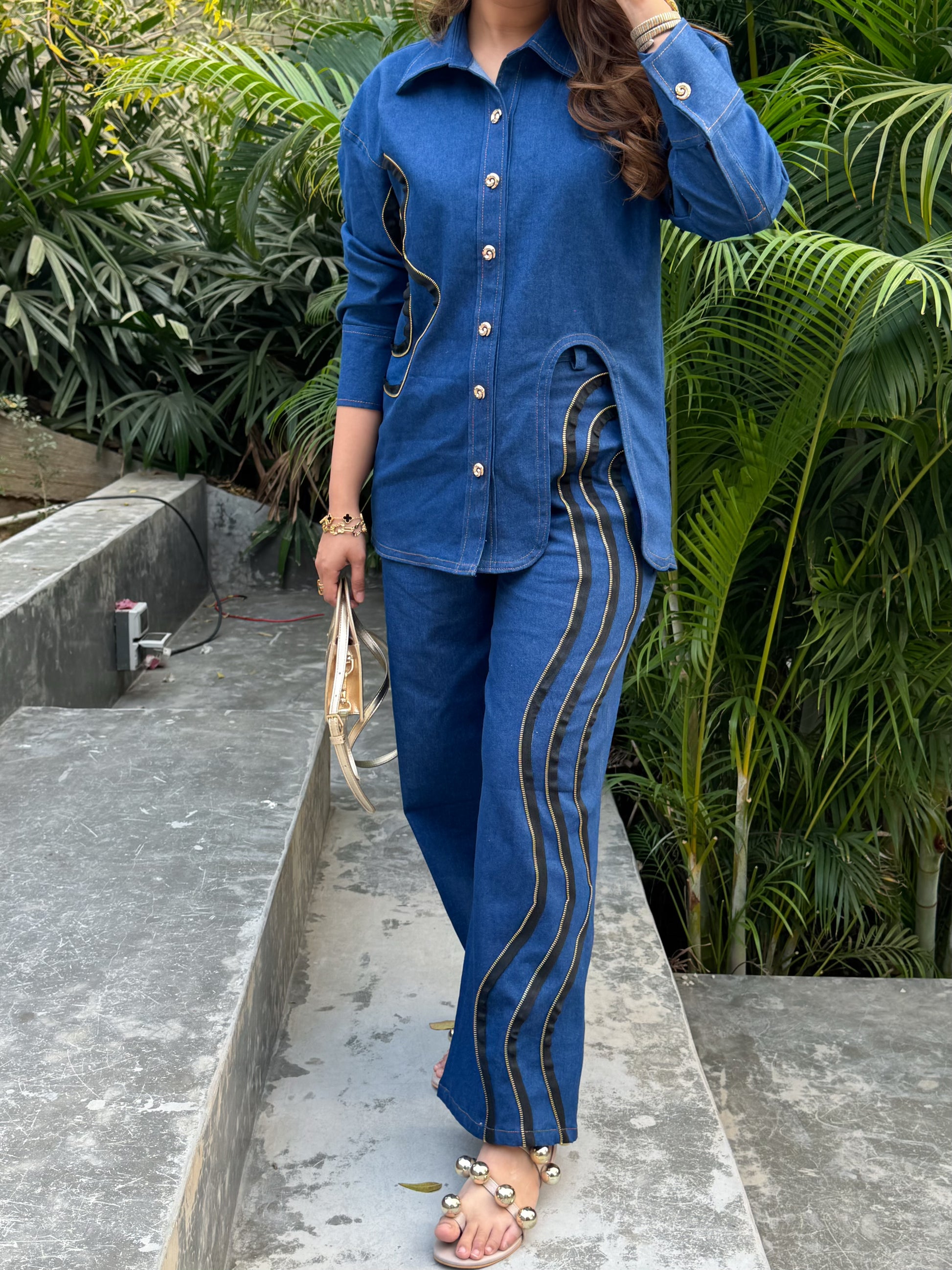 A statement denim co-ord set that plays with structure and detail. The tailored shirt features distinctive curve cut-out detailing with zipper accents, creating a sculpted and modern silhouette. Paired with wide-leg trousers finished with statement zipper lines, the look feels contemporary, polished, and effortlessly elevated.