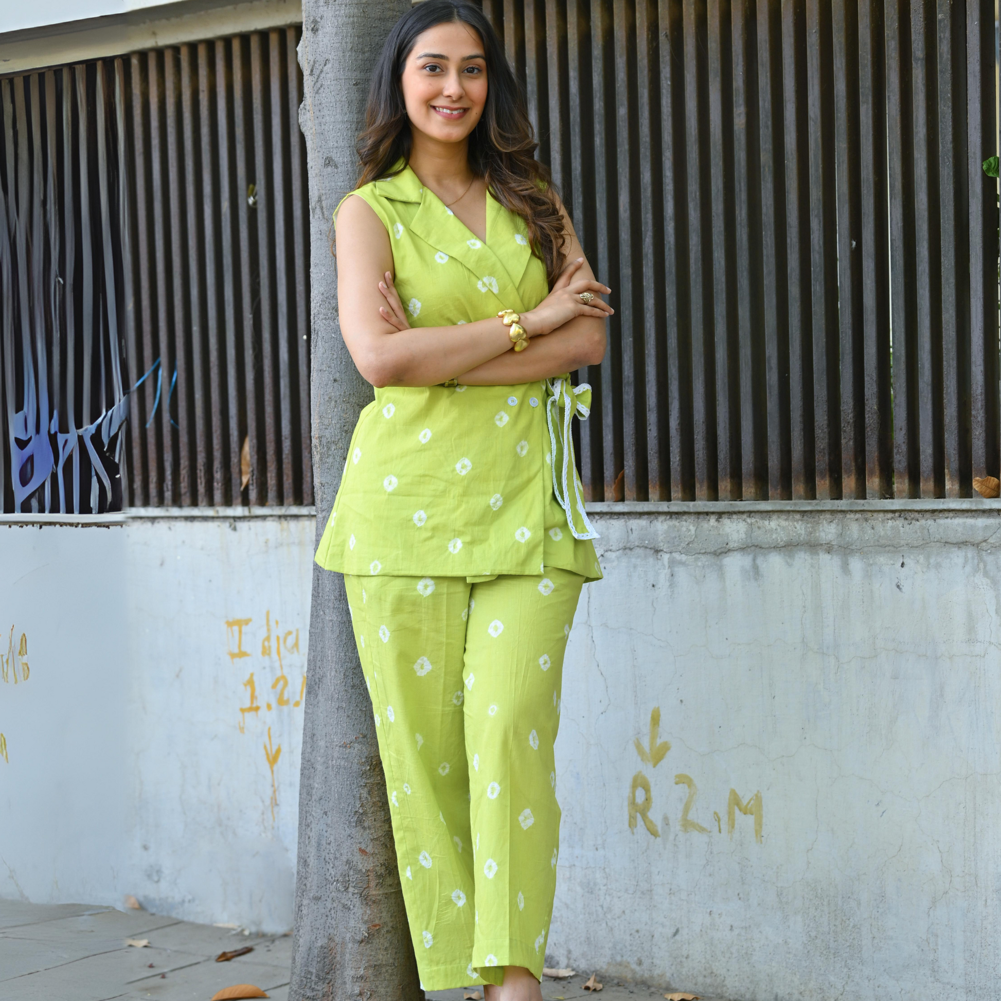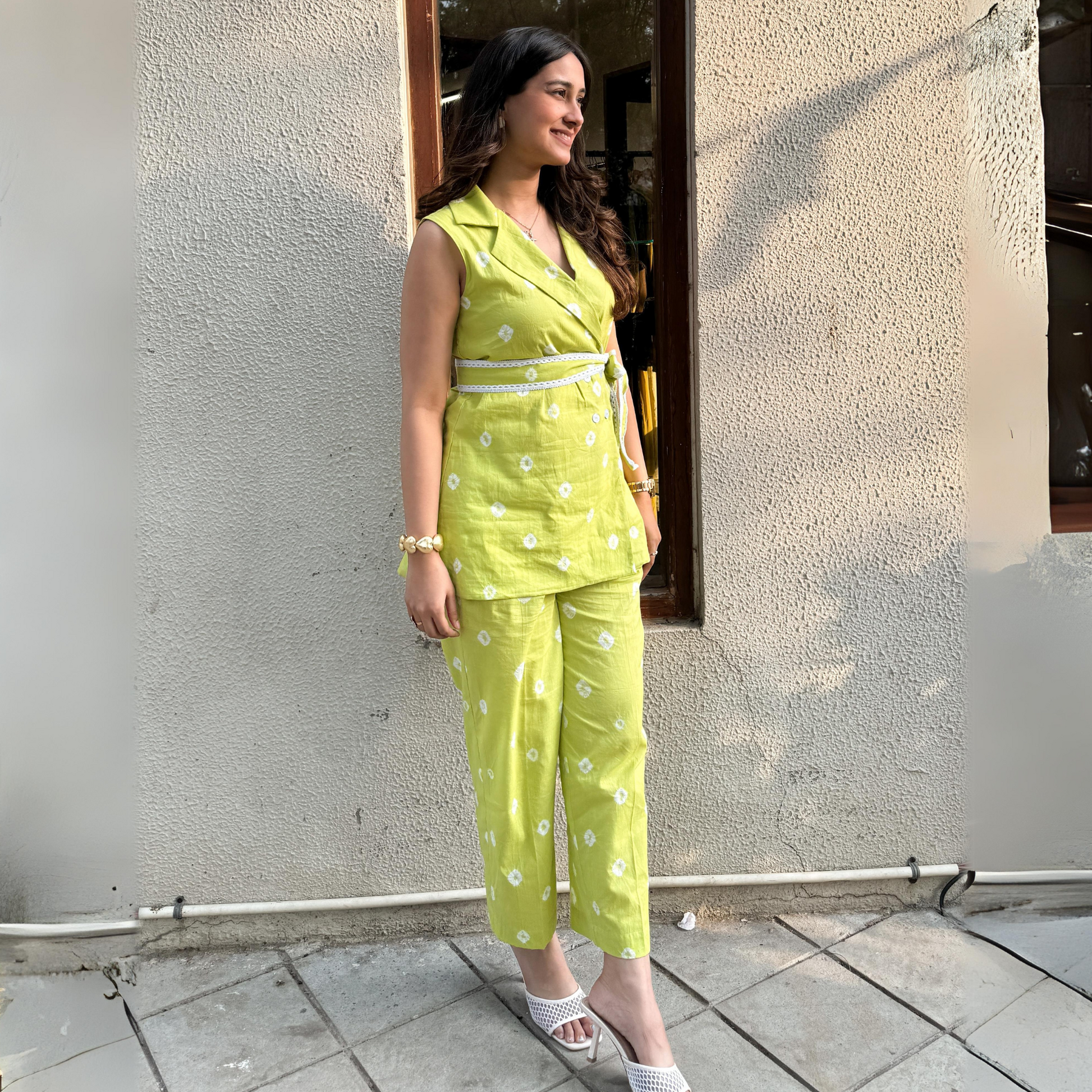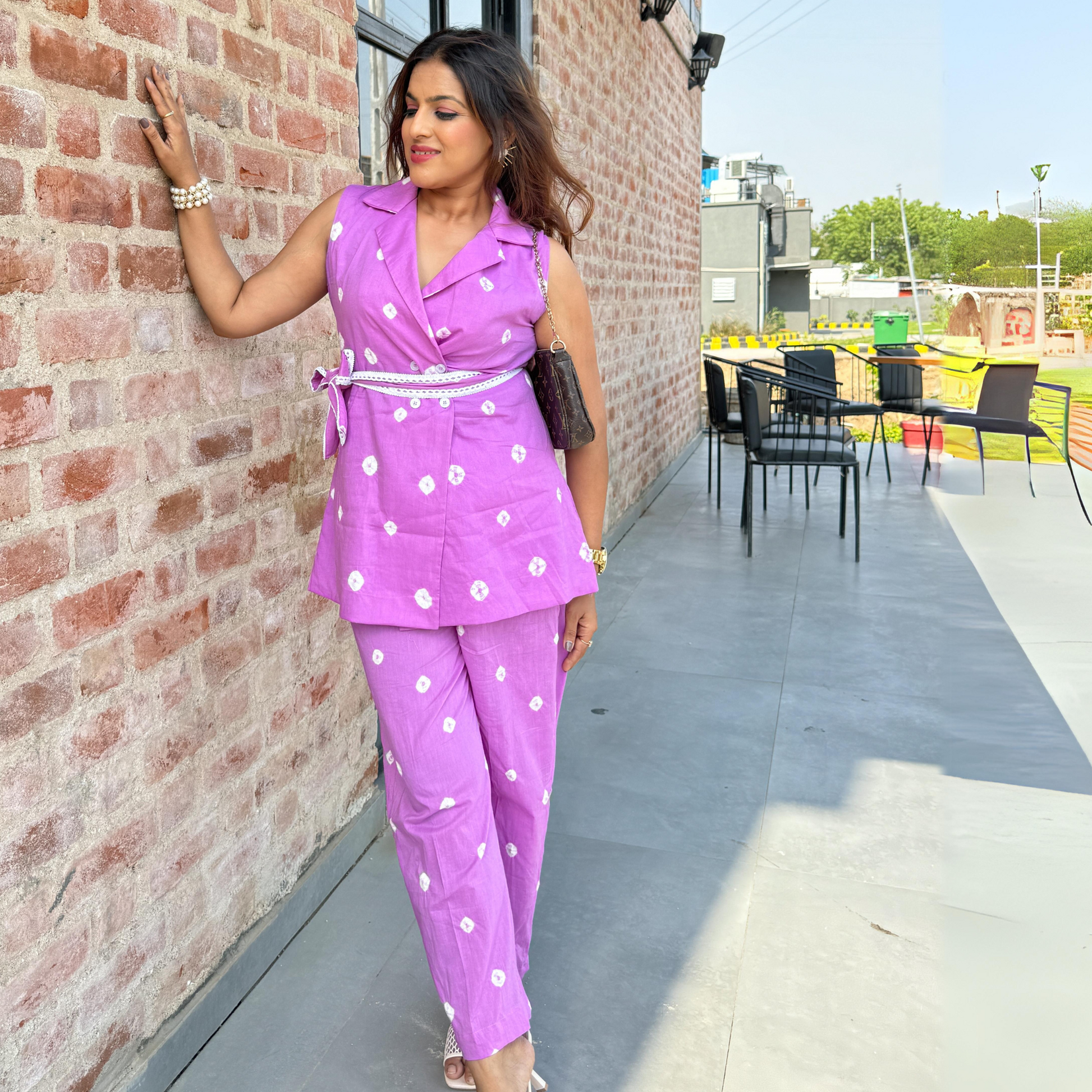 Hand tied and dyed in cotton this Sleeveless blazer set comes with a self fabric belt.  Pants have front belt and elastic at back.