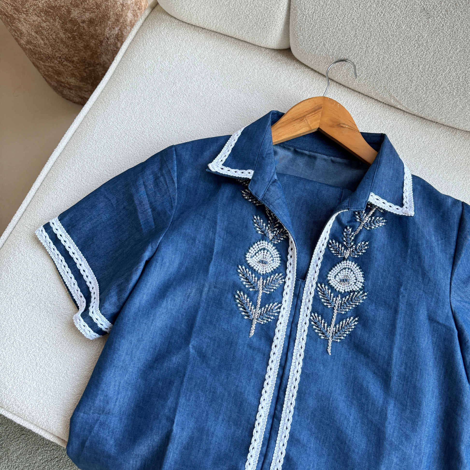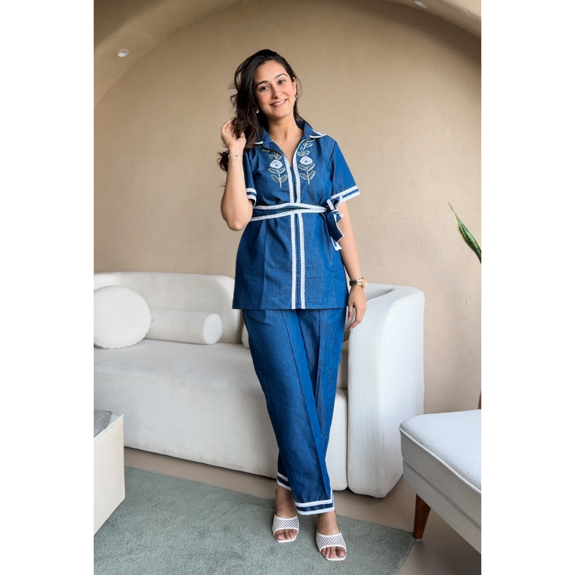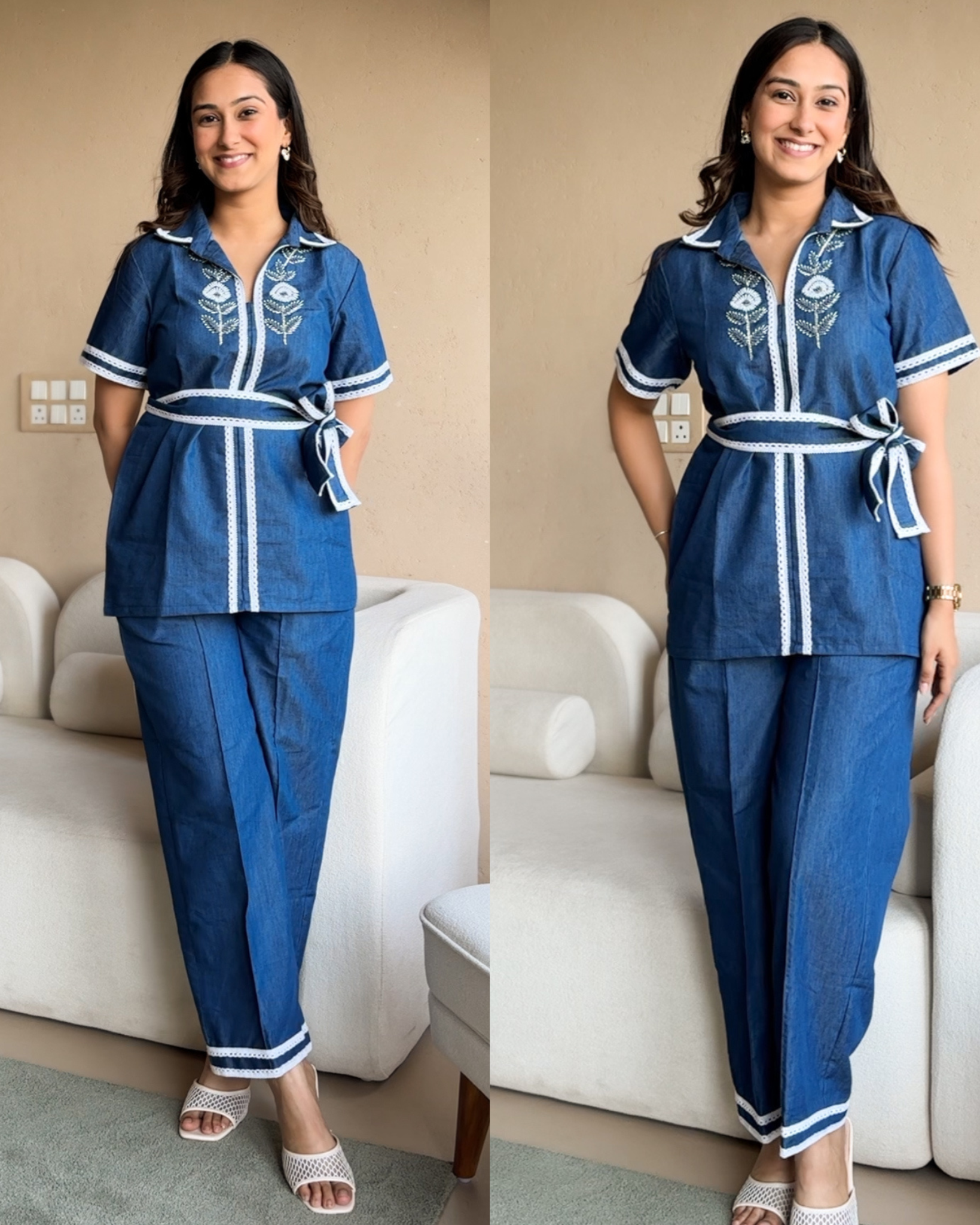 Made from Cotton Denim, the set beautifully features delicate handwork & lace detailing. The top has a kimono pattern fit while the pants features a straight wide fit.