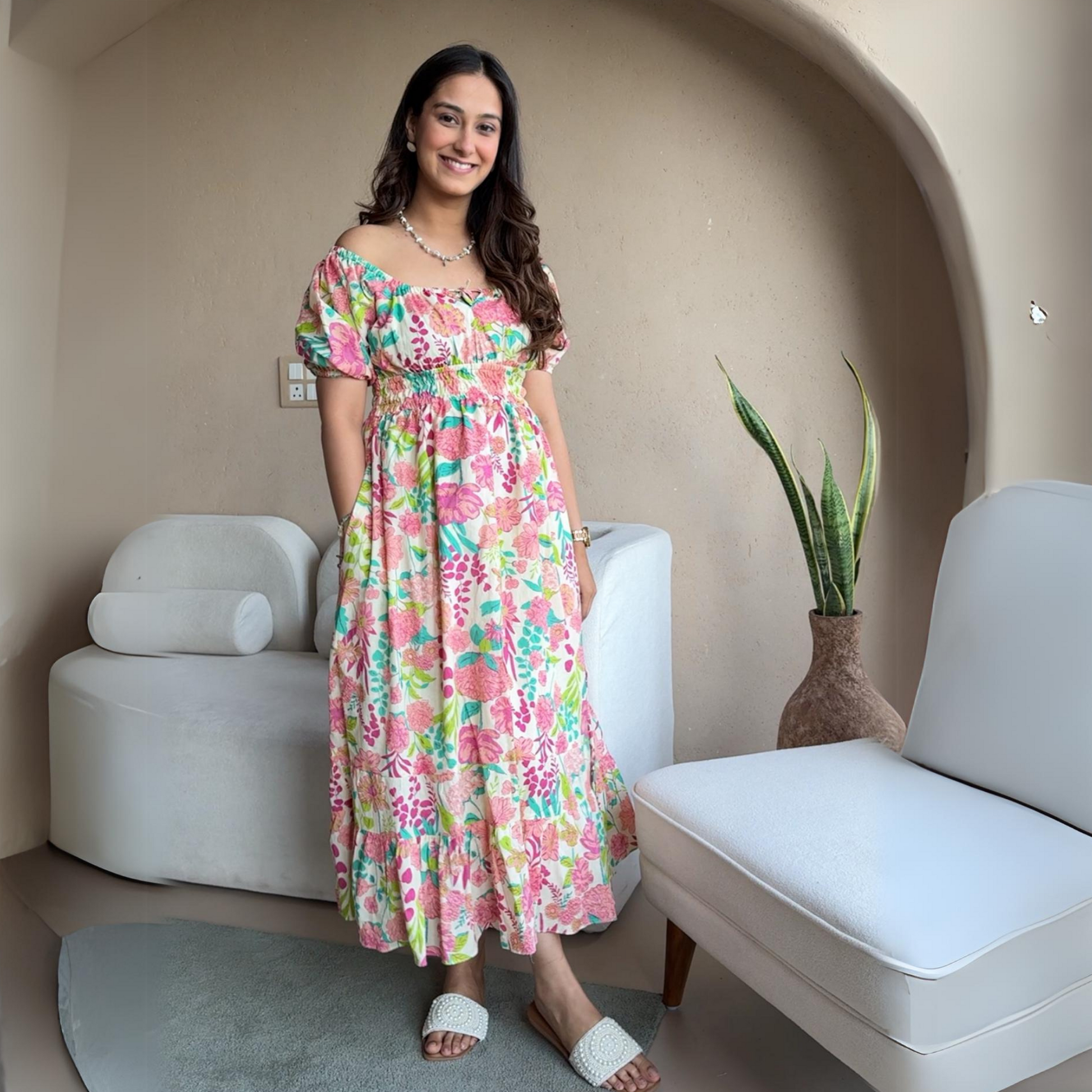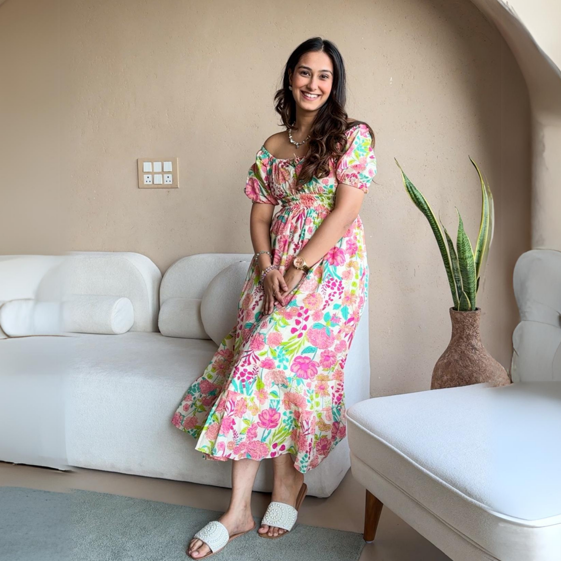 Dive into spring's charm with its blossoming floral pattern, perfect for any seasonal adventure with its effortless style.