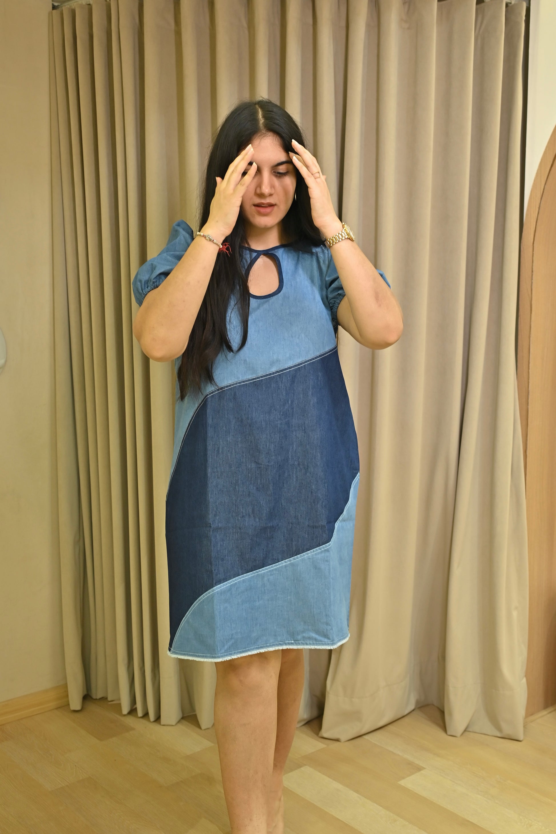Crafted with two shades of denim, it features a unique curved design and a charming keyhole neckline. The short puffy sleeves add a fun and feminine touch, making it a head-turner.