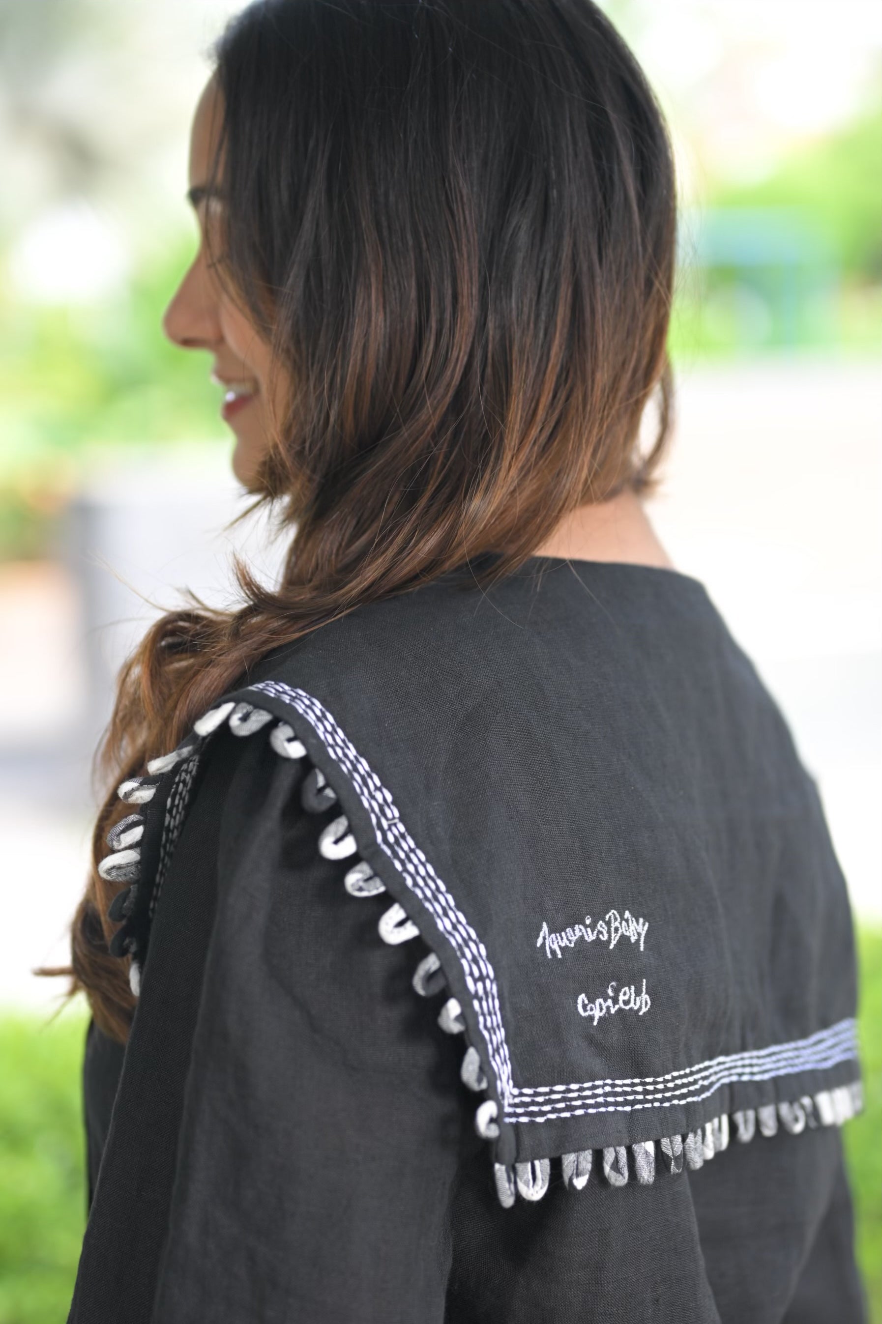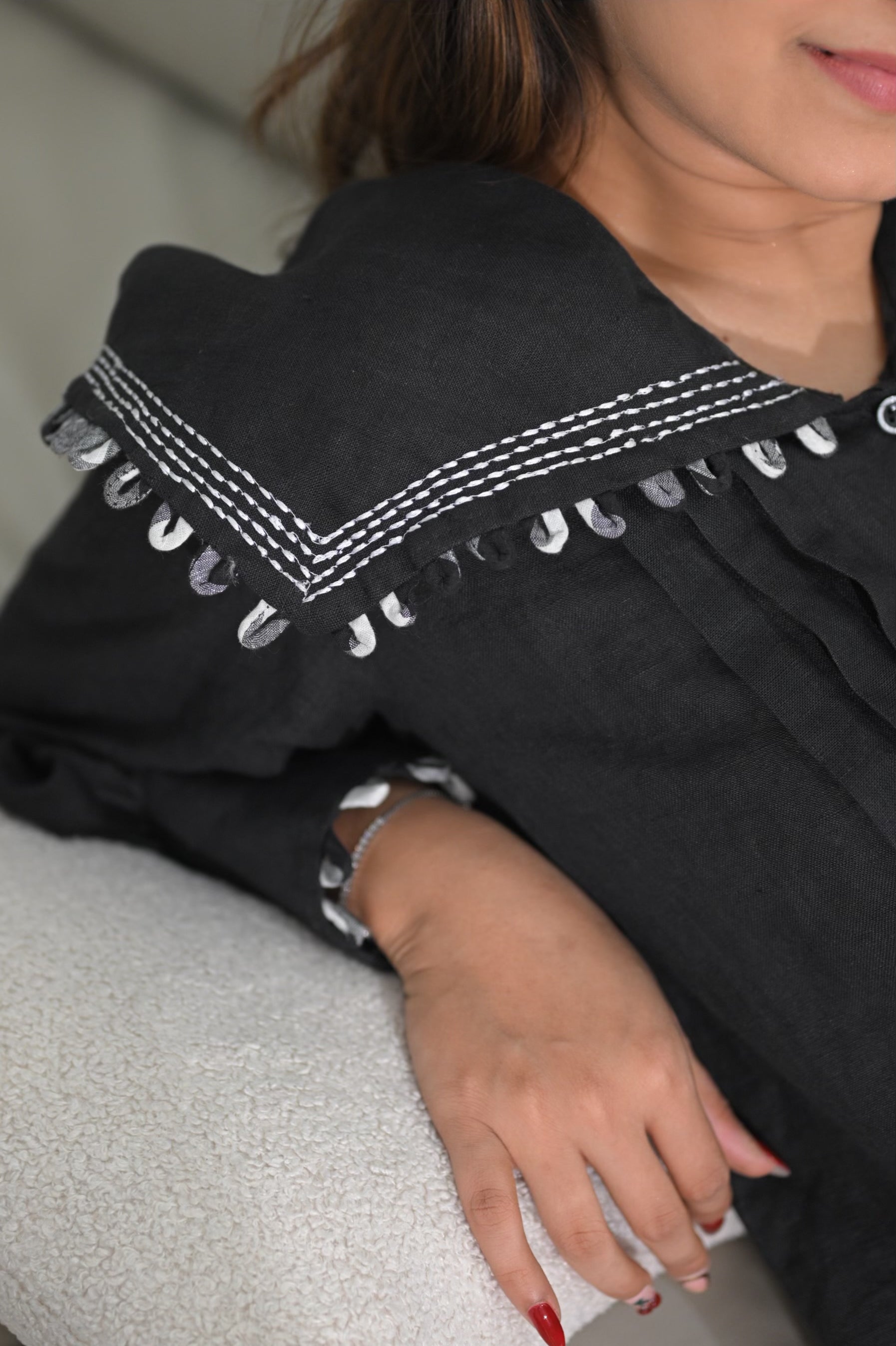 Premium black linen top with statement sailor collar, shell detailing, and front pleats. Structured fit that blends elegance with everyday ease.