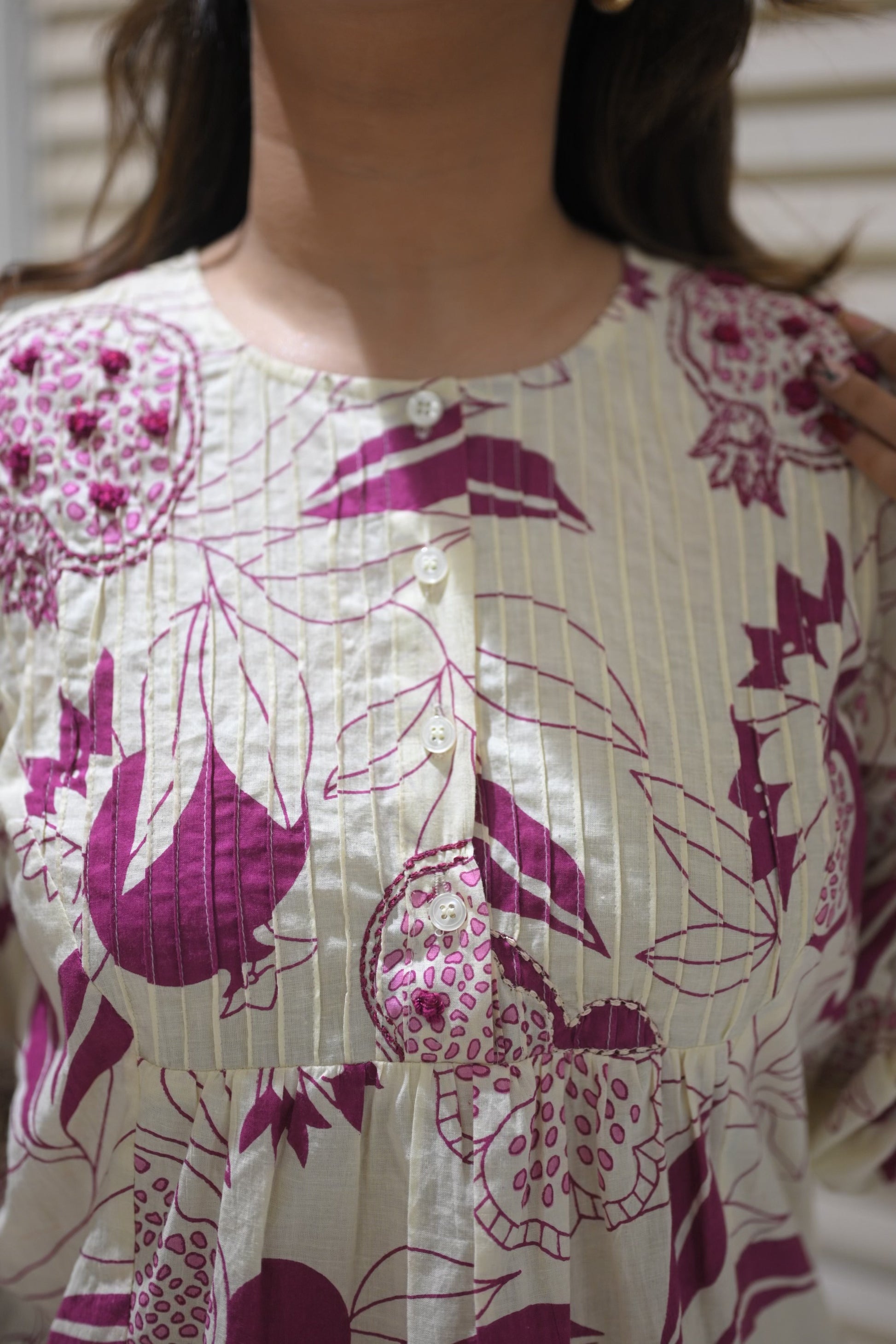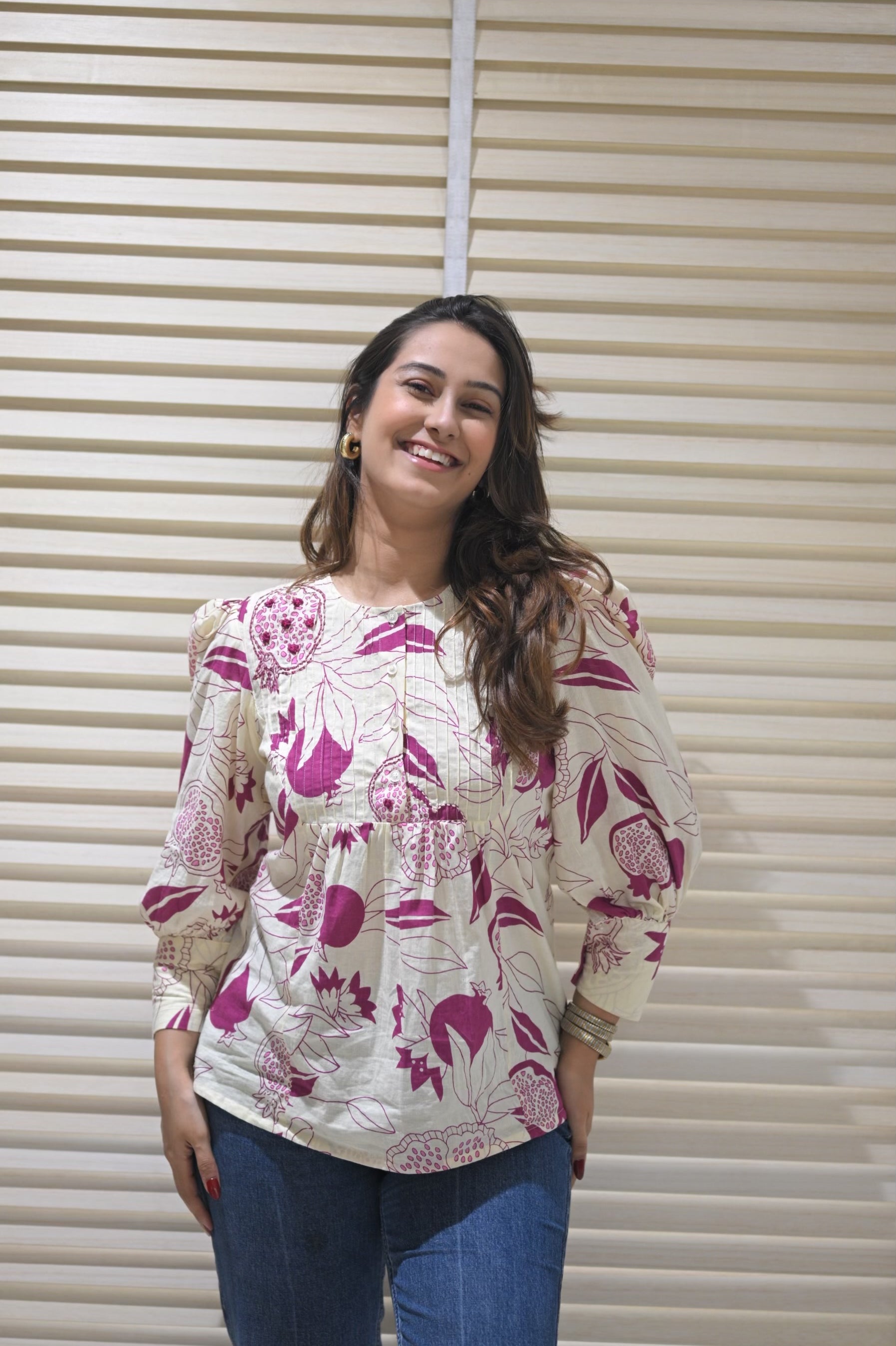Fresh, playful, and oh-so-comfy — our pomegranate print peplum top adds a pop of charm to your everyday style.