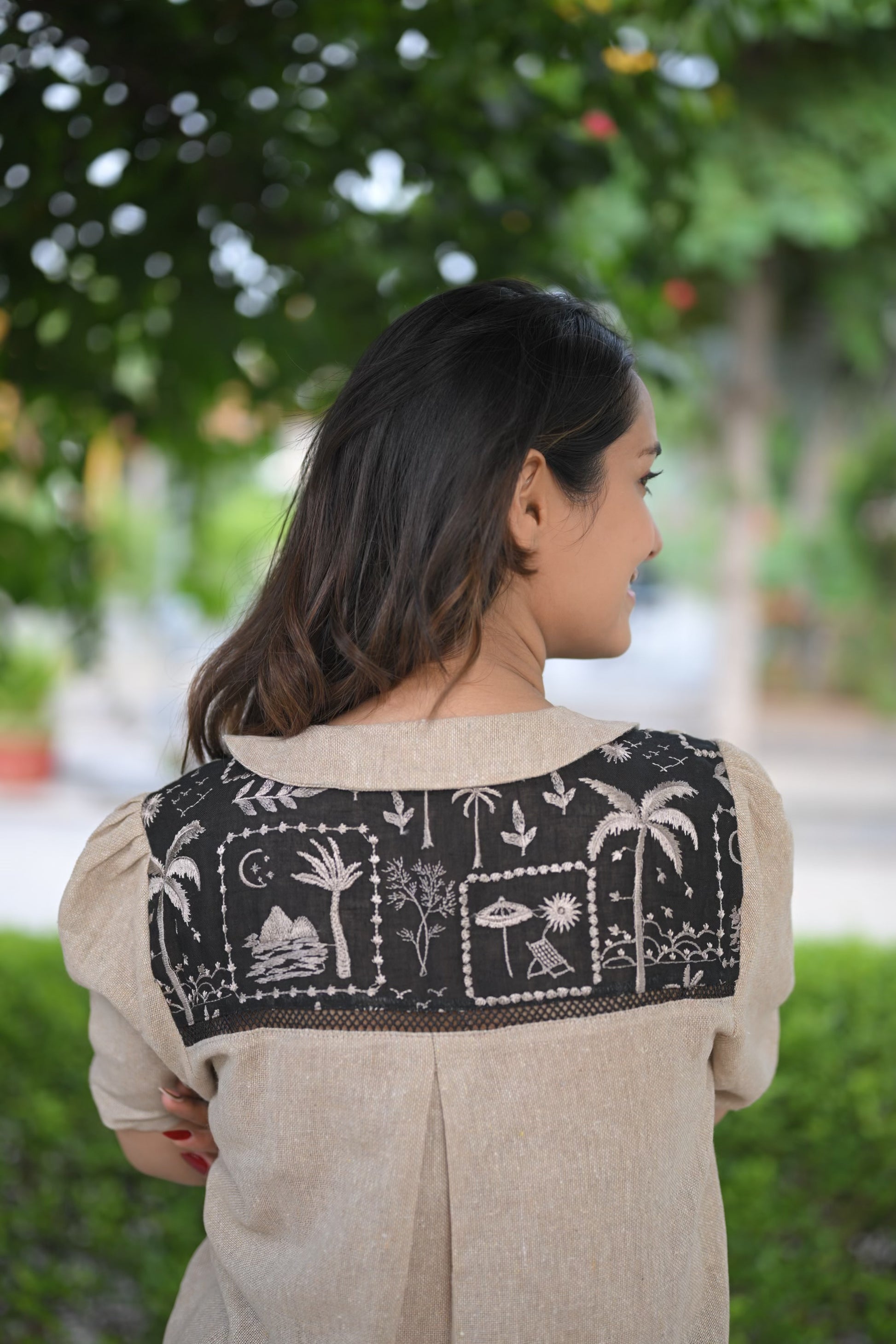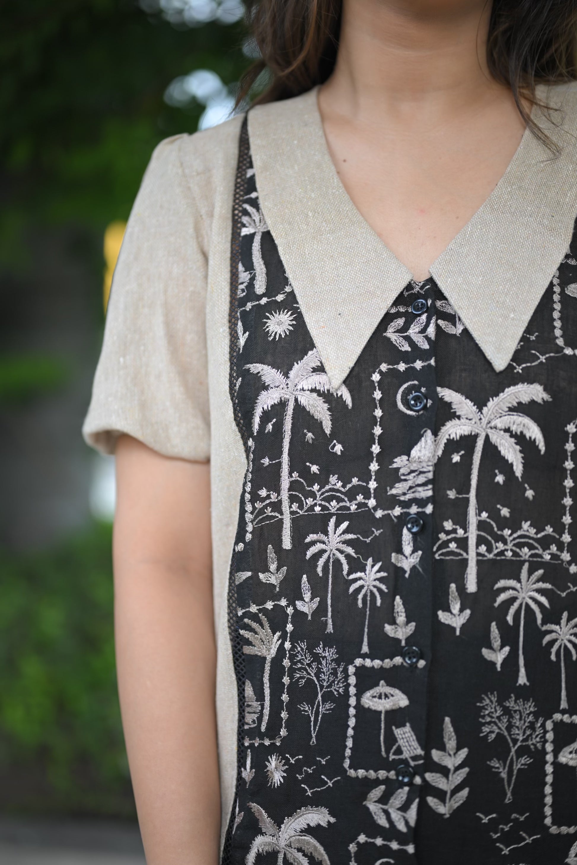 Rohina Shirt features a textured beige base, black embroidered panel with tropical motifs, and a wide pointed collar for a statement finish.
